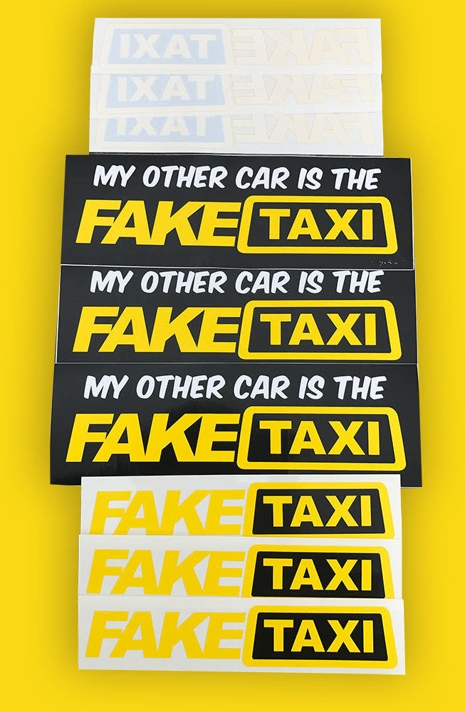 Fake Taxi Sticker Bundle – 9-Pack of pure filth. This bundle includes 9 stickers to spread the filthy fun wherever you go: 3 bumper stickers, 3 window stickers and 3 stick-anywhere-you-like stickers.